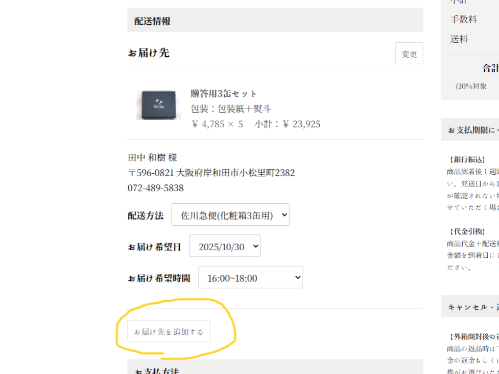 1, 「配送情報」欄にある「お届け先」の下側にある「お届け先を追加する」ボタンからお届け先住所編集画面に入ります。