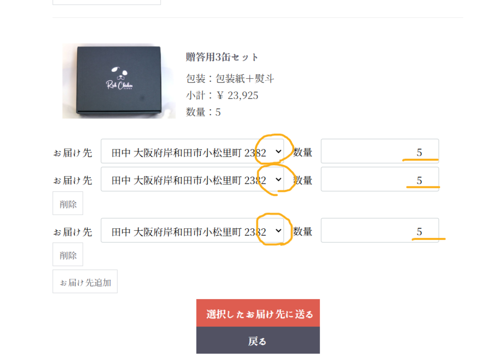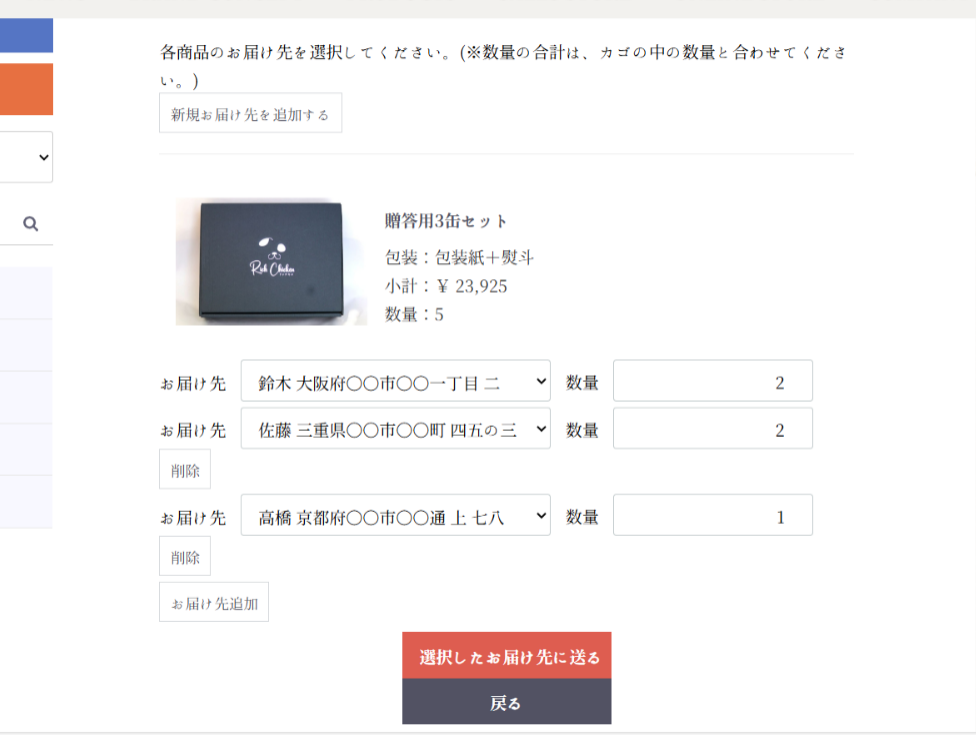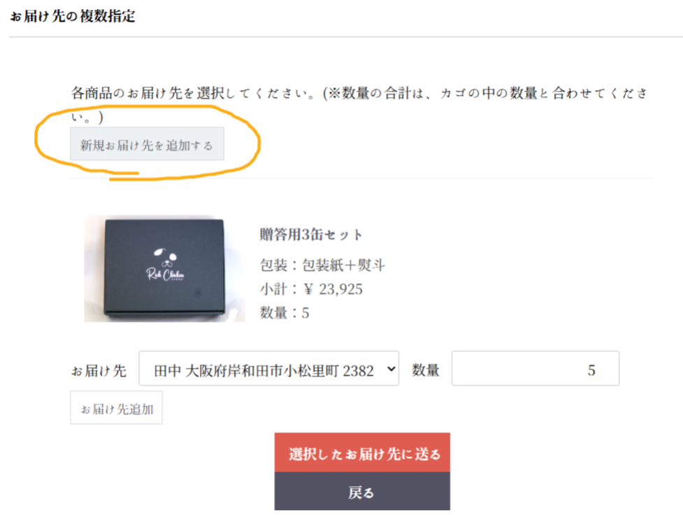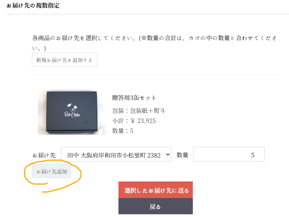 3, 各商品の項目の左下にある「お届け先追加」ボタンで宛先を増やします。